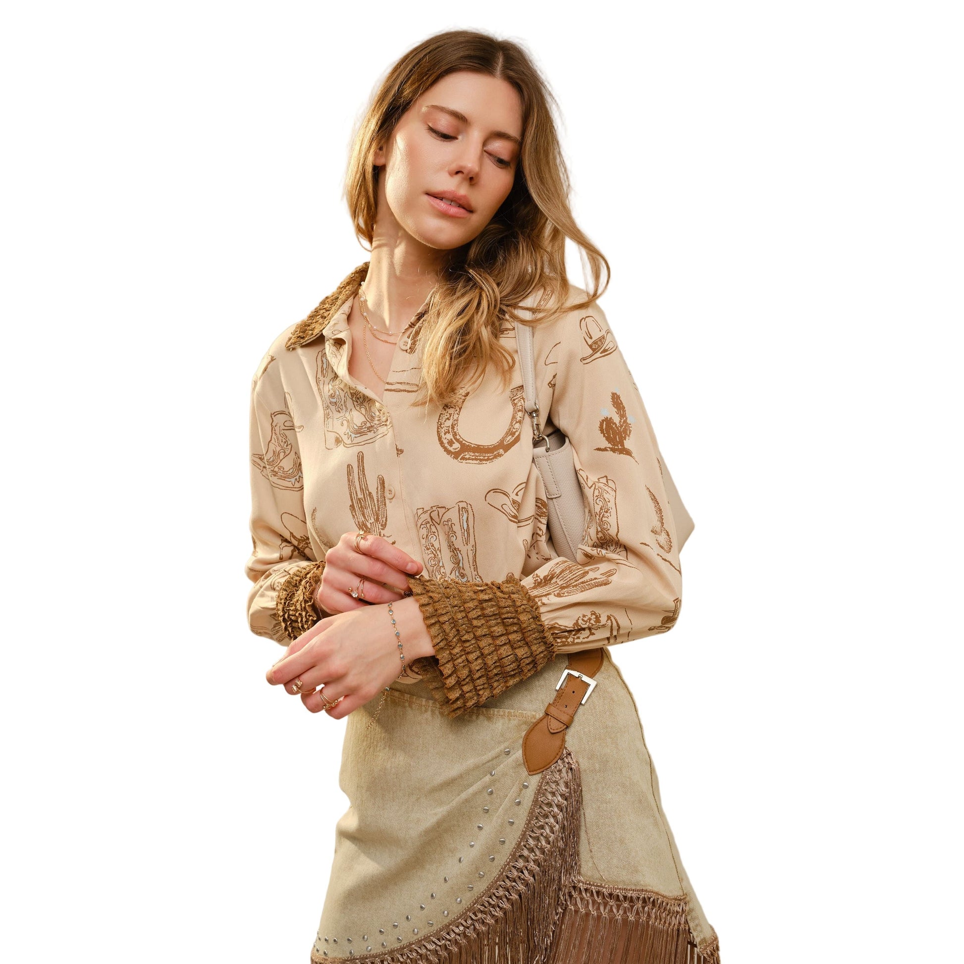 CAMISA CON MANGAS DE VUELOS CAMPANA Y ESTAMPADO TIPO COW.